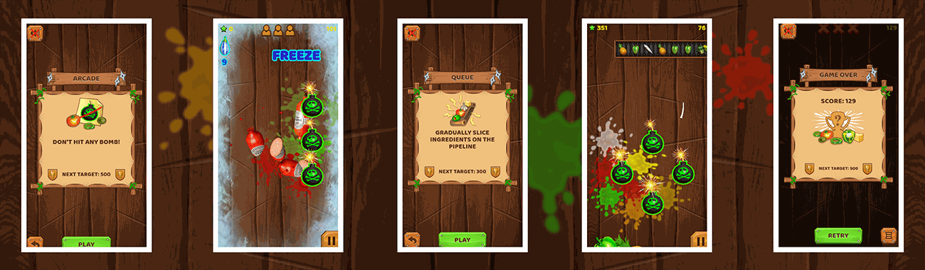 Once you have selected Trial, you will see that there is a target score you must reach. The game will then begin, to slice the toppings, slide your finger on the phone over the ingredient you want to slice. To slice multiple ingredients fast, keep sliding your finger across your phone so that you can slice them all. When playing, you will see that some of the Toppings will have different color outlines, these are bonuses. The yellow outline is "Freedom", this bonus means you can slice everything as well as bombs and you won't lose a life. The purple outline is "Double", which means every slice has the power of a double slice. This bonus is very useful when you have frozen toppings. When you see a topping frozen in a block of ice, you need to slice the ice to unfreeze it and then slice again to cut the topping. The Blue outline is "Freeze", this bonus freezes and slows down the chopping board, ingredients and bombs so that you can slice all the toppings easily and precisely without hitting a bomb. To see how long the bonus lasts, look at the top left-hand side of your screen where you will see your bonus countdown ticking away. Each bonus lasts for 10 seconds